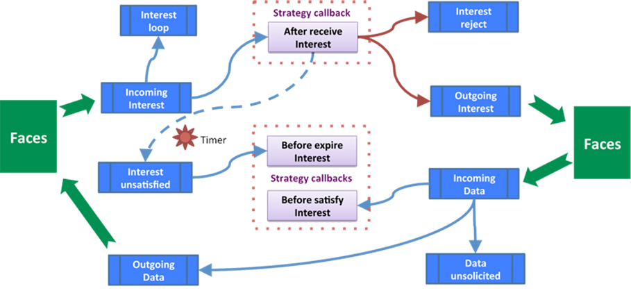 | multicast | 多播策略 | 将每个兴趣包转发给所有上游,由提供的FIB条目指示。 |