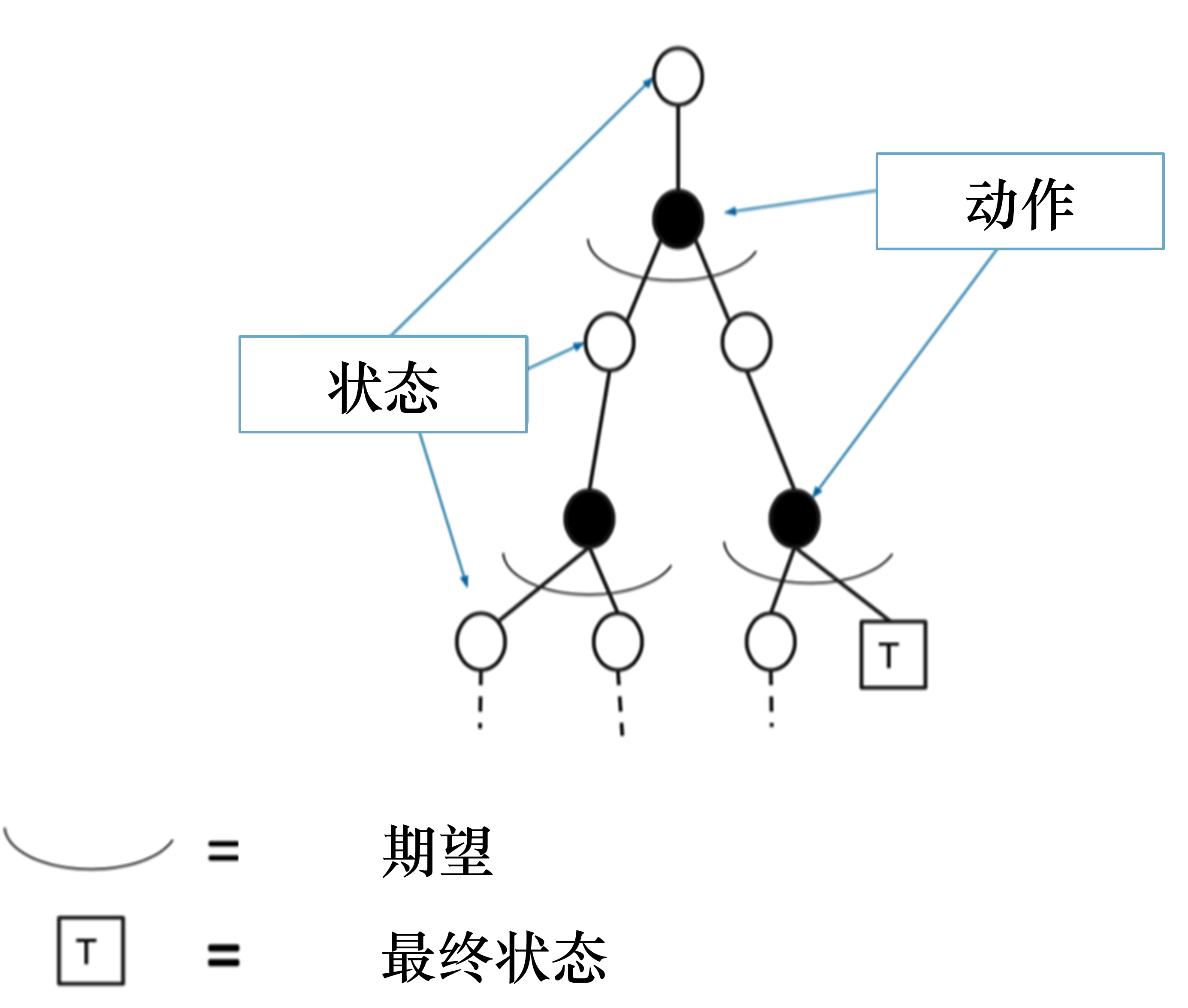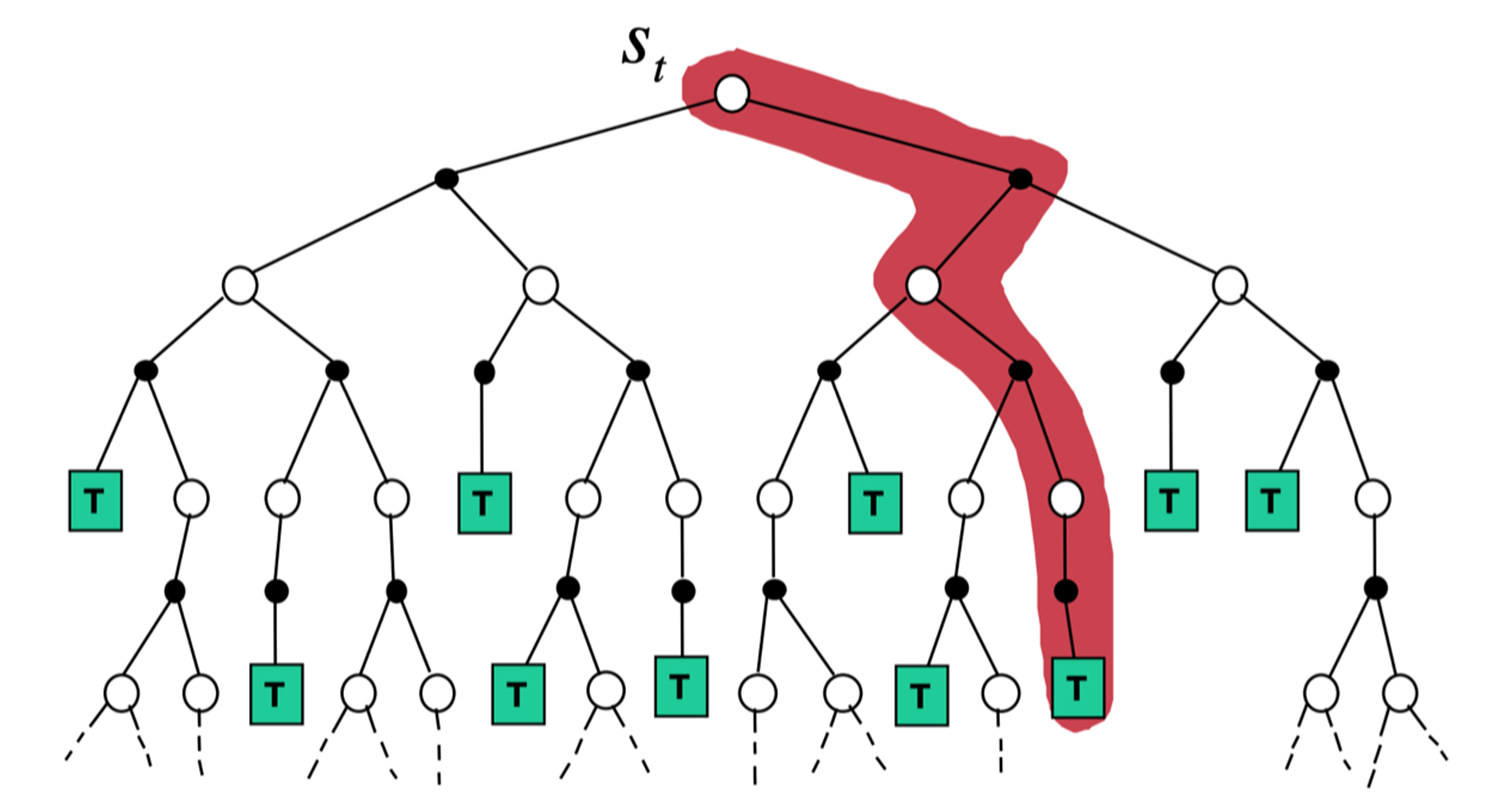 如图 3.20 所示,蒙特卡洛方法在当前状态下,采取一条支路,在这条路径上进行更新,更新这条路径上的所有状态,即