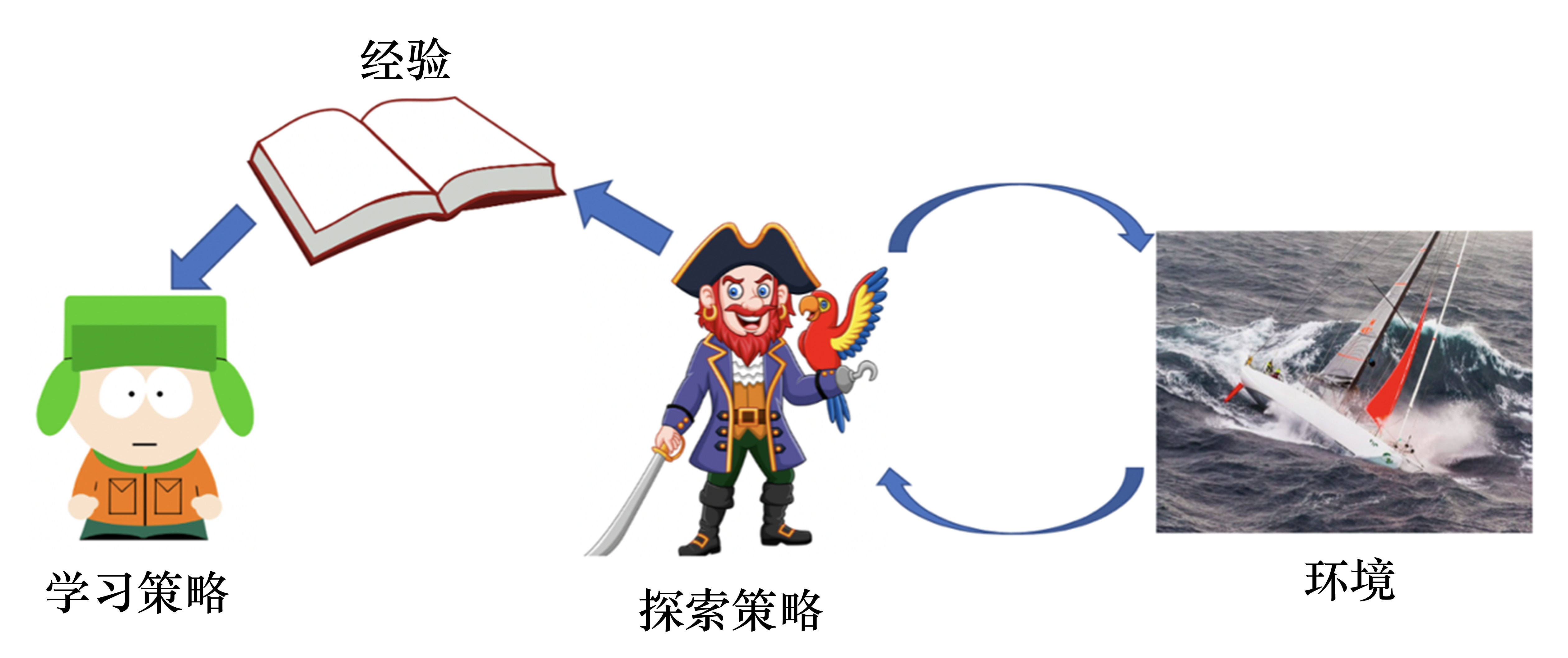 再例如,如图 3.32 所示,比如环境是波涛汹涌的大海,但学习策略(learning policy)太“胆小”了,无法直接与环境交互学习,所以我们有了探索策略(exploratory policy),探索策略是一个不畏风浪的海盗,它非常激进,可以在环境中探索。因此探索策略有很多经验,它可以把这些经验“写成稿子”,然后“喂”给学习策略。学习策略可以通过稿子进行学习。